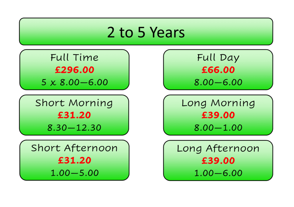 Session fees include all snacks, drinks, meals and activities, short outings and other extra-curricular experiences unless your child is attending for funded hours.