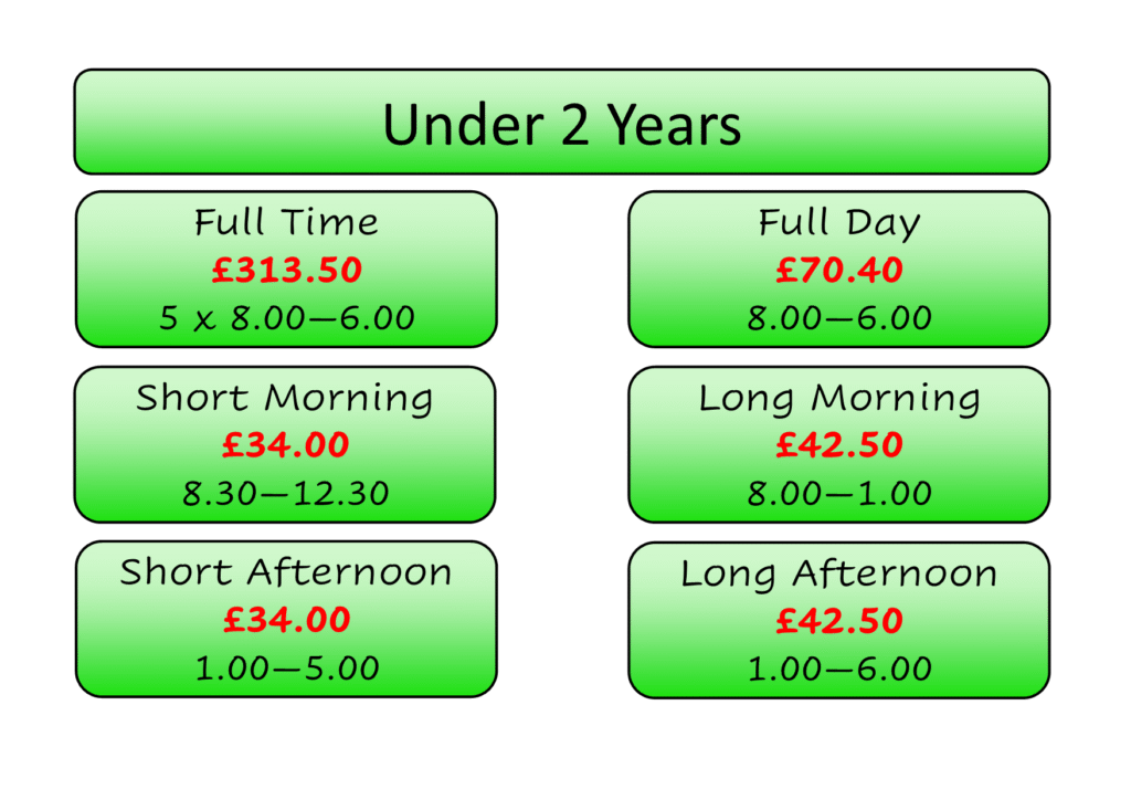 Fees are payable in advance either weekly or monthly on the first day of the week or month that your child attends. Full fees are payable in the event of illness or holidays. A minimum of 4 weeks written notice is to be given for cancellation of a nursery place or 4 weeks fees will be charged in lieu.